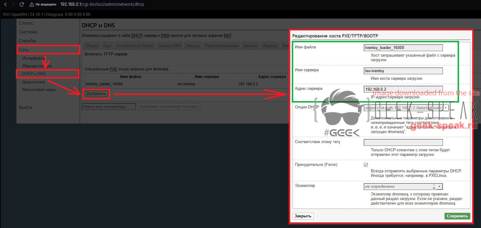 На этом настройка самого сервера PXE завершена, как видим сама по себе утилита довольна проста в использовании. Перейдем к настройке openwrt, чтоб локальные ПК «видели» PXE сервер поверх ipv4 выдаваемых с openwrt! Подключаемся к oprnwrt переходим в Сеть -> DHCP и DNS -> PXE/TFTP. В PXE параметры добавляем новые значения: