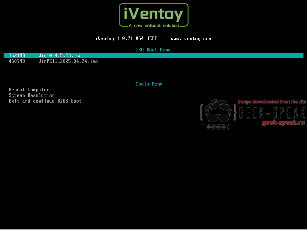 iVentoy – это простой PXE сервер, аналог «карманного» iODD, который работает на локальном ПК, хранит в себе ISO образы разных операционных систем (Window, Linux, VMware, LiveCD на базе WinPE или Linux, и т.д.) и позволят загружать (устанавливать) их на компьютеры по локальной сети. Для запуска PXE сервера достаточно скопировать ISO файлы с дистрибутивами операционных систем и запустить приложение iVentoy. После этого любой компьютер с поддержкой PXE загрузки сможет загрузиться с него и в меню выбрать любой из доступных ISO образов для загрузки.